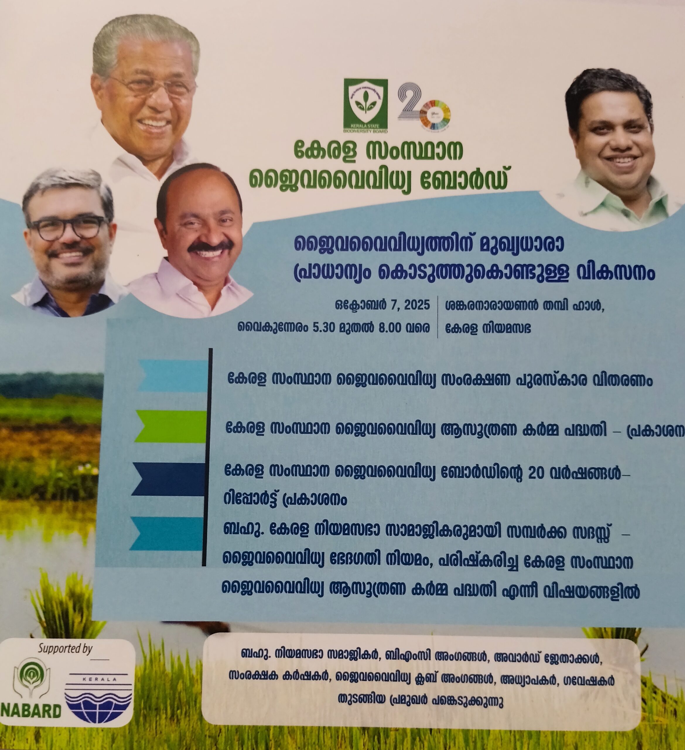 കേരള സംസ്ഥാന ജൈവവൈവിധ്യ ബോർഡിൻ്റെ ആഭിമുഖ്യത്തിൽ 2025 ഒക്ടോബർ 7-ന് തിരുവനന്തപുരത്തെ കേരള നിയമസഭാ സമുച്ചയത്തിലെ ശങ്കരനാരായണൻ തമ്പി ഹാളിൽ, ബഹു. നിയമസഭാ അംഗങ്ങൾക്ക് വേണ്ടി ജൈവവൈവിധ്യ സംരക്ഷണവുമായി ബന്ധപ്പെട്ട. വിവിധ പരിപാടികൾ സംഘടിപ്പിക്കും. പുതുക്കിയ ജൈവവൈവിധ്യ നിയമവും ചട്ടവുമായി! ബന്ധപ്പെട്ട വിവരങ്ങൾ പങ്കുവെക്കുകയും, ബഹു. എം.എൽ.എ.മാരുമായി സമ്പർക്ക സദസ്സി നടത്തുകയും വിവിധ പുസ്തക പ്രകാശനങ്ങളും പുരസ്കാര വിതരണവും പരിപാടിയിൽ ഉൾപ്പെടുത്തിയിട്ടുണ്ട്.