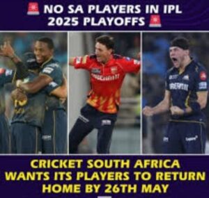 30നാണ് ദക്ഷിണാഫ്രിക്കന്‍ താരങ്ങള്‍ ലോക ടെസ്റ്റ് ചാമ്പ്യൻഷിപ്പിനായി ഇംഗ്ലണ്ടിലെത്തേണ്ടത്. അതേസമയം, ലോക ടെസ്റ്റ് ചാമ്പ്യൻഷിപ്പ് ഫൈനലില്‍ കളിക്കാത്ത ദക്ഷിണാഫ്രിക്കന്‍ താരങ്ങളായ ഡെവാള്‍ഡ് ബ്രെവിസ്(ചെന്നൈ), ഫാഫ് ഡൂപ്ലെസി, ഡൊണോവന്‍ ഫെരേര(ഡല്‍ഹി ക്യാപിറ്റൽസ്), ജെറാള്‍ഡ് കോട്സി(ഗുജറാത്ത് ടൈറ്റന്‍സ്), ക്വിന്‍റണ്‍ ഡി കോക്ക്, ആന്‍റിച്ച് നോര്‍ക്യ(കൊല്‍ക്കത്ത), ഡേവിഡ് മില്ലര്‍(ലക്നൗ), നാന്ദ്രെ ബര്‍ഗര്‍(രാജസ്ഥാന്‍ റോയല്‍സ്), ഹെന്‍റിച്ച് ക്ലാസന്‍(ഹൈദരാബാദ്) എന്നിവര്‍ക്ക് ഐപിഎല്ലില്‍ തുടര്‍ന്നും കളിക്കാം.