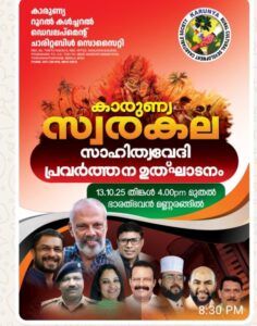 തിരു: കാരുണ്യ റൂറൽ കൾച്ചറൽ ഡെവലപ്മെന്റ് ചാരിറ്റബിൾ സൊസൈറ്റിയുടെ നേതൃത്വത്തിലുള്ള- കാരുണ്യ സ്വരകല സാഹിത്യ വേദിയുടെ പ്രവർത്തന ഉദ്ഘാടനം 13.10.25 തിങ്കൾ 5 മണിക്ക് ഭാരത് ഭവൻ മണ്ണരങ്ങിൽ ഡോ. പ്രമോദ് പയ്യനൂരിന്റെ അദ്ധ്യക്ഷതയിൽ ചലച്ചിത്ര താരം എം. ആർ. ഗോപകുമാർ ഉത് ഘാടനം ചെയ്തു തുടക്കം കുറിക്കുന്നു.