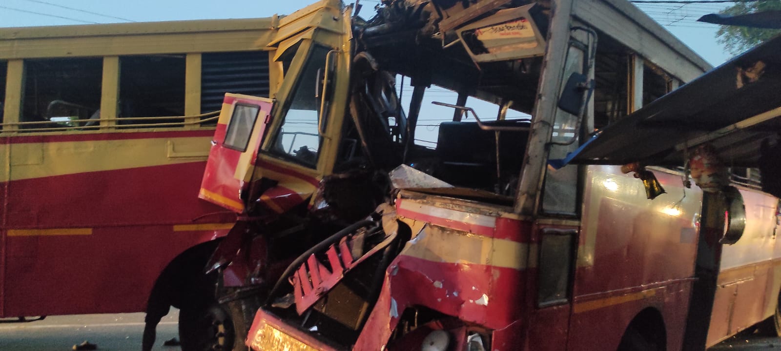 രണ്ട് ബസിലെയും ഡ്രൈവർമാരെ ഏറെ പണിപ്പെട്ടാണ് ഫയർഫോഴ്സും പൊലീസും പുറത്തെത്തിച്ചത്. ഒരാളുടെ കാലിന് ഗുരുതരമായി പരുക്കേറ്റിട്ടുണ്ട്. സമീപത്തുള്ള ആശുപത്രിയിലേക്ക് ഇവരെ മാറ്റിയിരിക്കുകയാണ്. ബസുകളിലുണ്ടായിരുന്ന 8 യാത്രകാർക്ക് നിസ്സാരമായി പരുക്കേറ്റിട്ടുണ്ട്. അപകടത്തിൽ ബസിന്റെ മുൻവശം പൂർണമായും തകർന്നു.