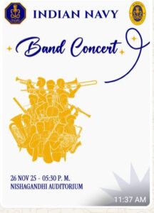 നാവിക ദിനാഘോഷങ്ങളുടെ ഭാഗമായി, നവംബർ 26-ന് തിരുവനന്തപുരത്തെ നിശാഗന്ധി ഓഡിറ്റോറിയത്തിൽ വൈകിട്ട് 5:30 – ന് ഇന്ത്യൻ നാവികസേനാ ബാൻഡ് സംഗീത വിരുന്ന് സംഘടിപ്പിക്കുന്നു.
