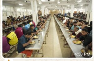 മൂന്നുനേരമായാണ് ഭക്ഷണം വിളമ്പുന്നത്. രാവിലെ ആറു മുതല് 11 മണി വരെ ഉപ്പുമാവ്,കടലക്കറി,ചുക്കുകാപ്പി, തിളപ്പിച്ചാറിയ വെള്ളം എന്നിവ നല്കും. ഉച്ചയ്ക്ക് പന്ത്രണ്ടിനാരംഭിക്കുന്ന ഉച്ചഭക്ഷണം 3.30 വരെ നീളും. പുലാവ്, ദാല്കറി, അച്ചാര് എന്നിവയാണ് ഉച്ചയ്ക്ക് വിളമ്പുന്നത്. വൈകീട്ട് 6.45 മുതലാണ് അത്താഴവിതരണം. ഇത് നട അടയ്ക്കുന്നതുവരെ തുടരും. കഞ്ഞിയും പുഴുക്കു(അസ്ത്രം)മാണ് നല്കുന്നത്.