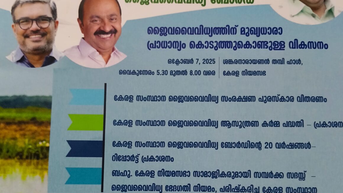 കേരള സംസ്ഥാന ജൈവവൈവിധ്യ ബോർഡിൻ്റെ ആഭിമുഖ്യത്തിൽ 2025 ഒക്ടോബർ 7-ന് തിരുവനന്തപുരത്തെ കേരള നിയമസഭാ സമുച്ചയത്തിലെ ശങ്കരനാരായണൻ തമ്പി ഹാളിൽ, ബഹു. നിയമസഭാ അംഗങ്ങൾക്ക് വേണ്ടി ജൈവവൈവിധ്യ സംരക്ഷണവുമായി ബന്ധപ്പെട്ട. വിവിധ പരിപാടികൾ സംഘടിപ്പിക്കും. പുതുക്കിയ ജൈവവൈവിധ്യ നിയമവും ചട്ടവുമായി! ബന്ധപ്പെട്ട വിവരങ്ങൾ പങ്കുവെക്കുകയും, ബഹു. എം.എൽ.എ.മാരുമായി സമ്പർക്ക സദസ്സി നടത്തുകയും വിവിധ പുസ്തക പ്രകാശനങ്ങളും പുരസ്കാര വിതരണവും പരിപാടിയിൽ ഉൾപ്പെടുത്തിയിട്ടുണ്ട്. ചടങ്ങിന്റെ ഭാഗമായി “കേരള ജൈവവൈവിധ്യ സംരക്ഷണ പുരസ്കാരങ്ങൾ” വിതരണം. ചെയ്യുന്നതോടൊപ്പം, പുതുക്കിയ “കേരള ജൈവവൈവിധ്യ […]